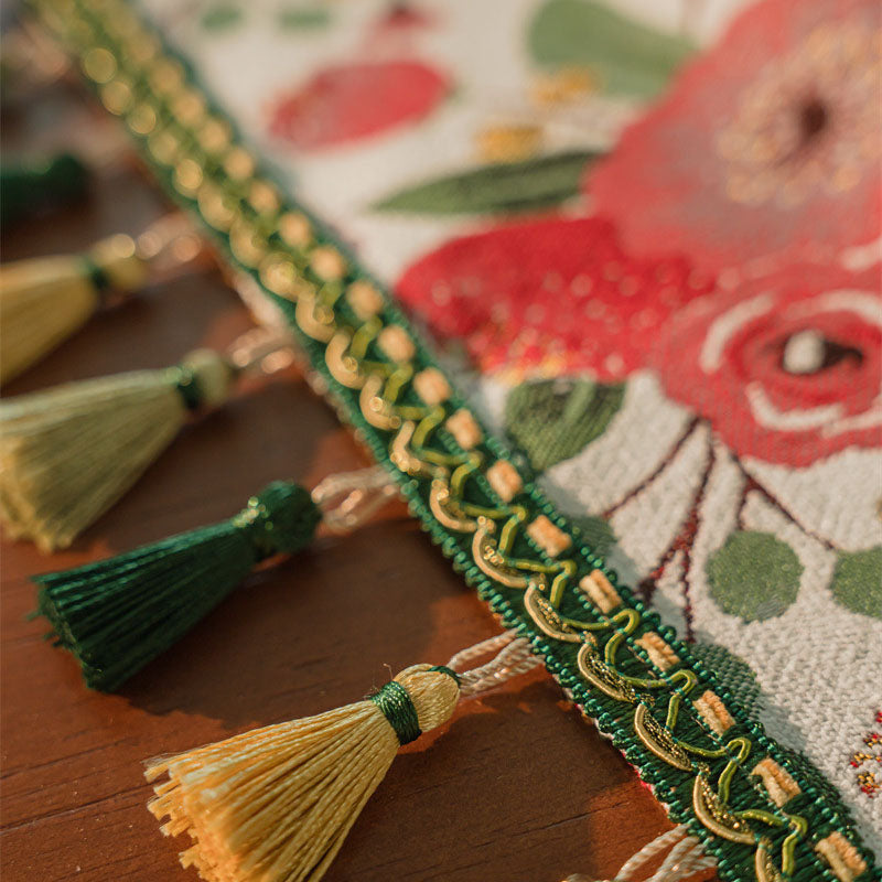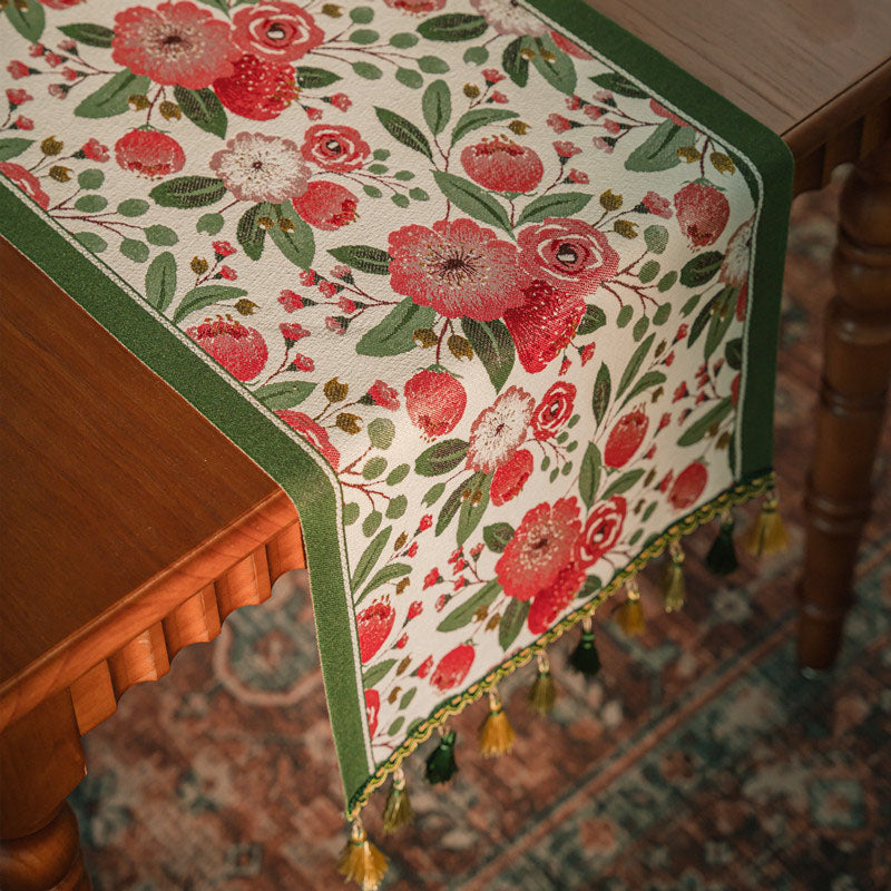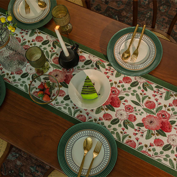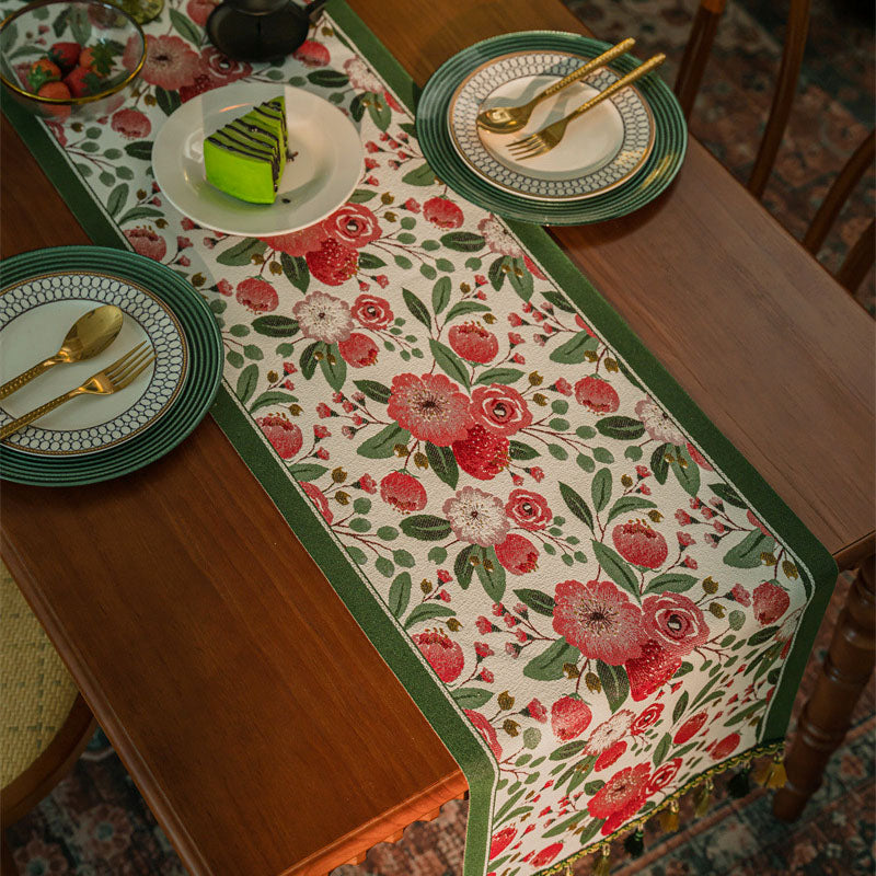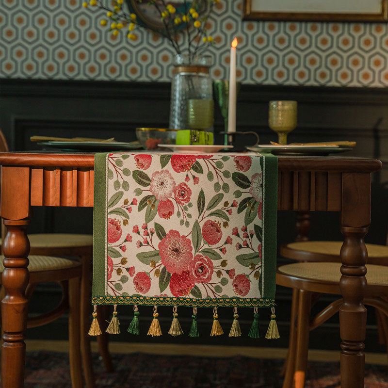 The Isadora Vintage Embroidered Camellia pattern table runner with gorgeous finished edges drapes gracefully across your table.